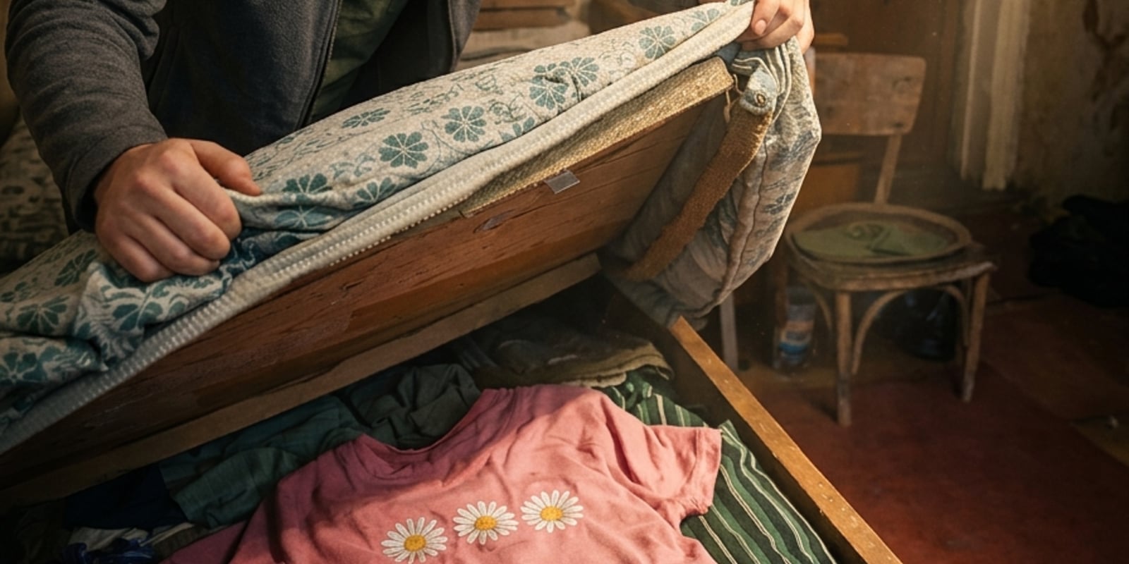 Под матрасом лежала одежда. Аккуратно сложенная, будто кто-то спрятал её намеренно. Розовая ткань, простые швы и маленькие ромашки, вышитые вручную.