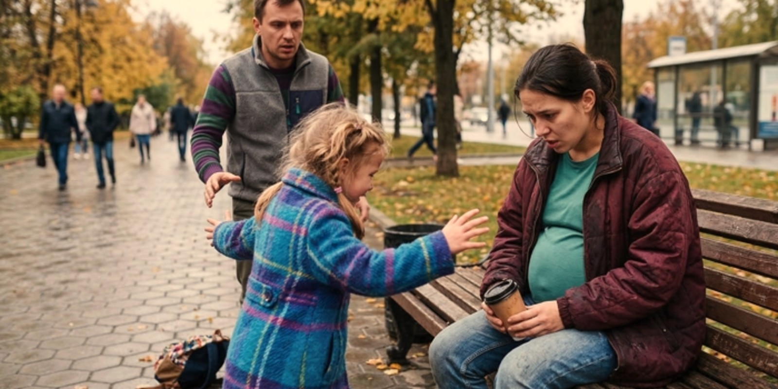 Октябрьский ветер пробирал до костей. Тимур зябко поднял воротник кашемирового пальто, глядя, как его семилетняя дочь Ксюша вдруг срывается с места и бежит к старой деревянной скамейке у неработающего фонтана. Там, съежившись от холода, сидела женщина. На ней была бесформенная, явно с чужого плеча куртка, под которой отчетливо выпирал огромный живот. В покрасневших пальцах она сжимала бумажный стаканчик.