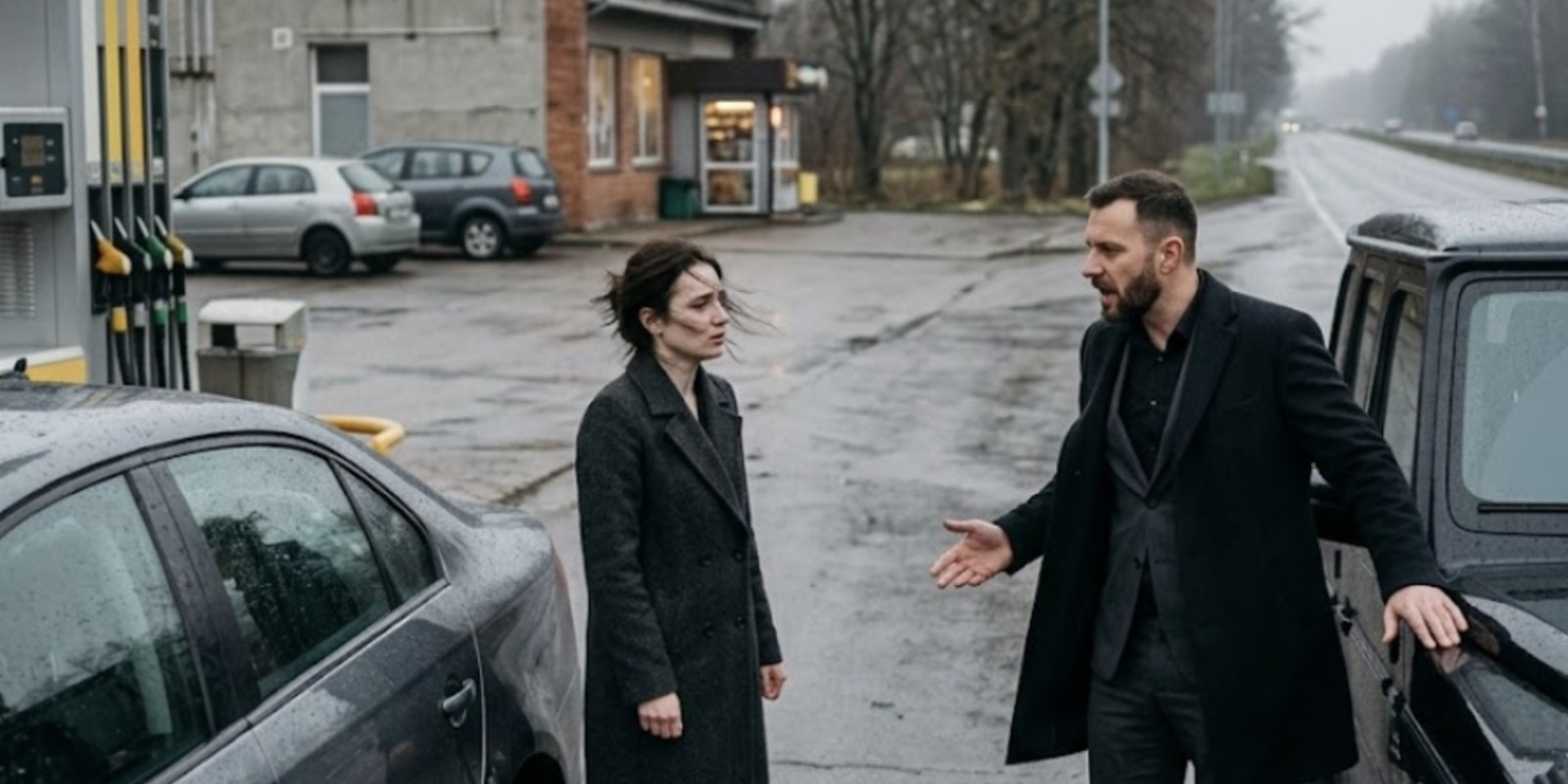 Она подъехала к колонке и уже собиралась выйти, когда с визгом тормозов рядом встал чёрный внедорожник. Дорогой, чистый, слишком нарядный для этой серой трассы. Из него вышел мужчина лет пятидесяти — дорогое пальто, ухоженные руки, тяжёлый взгляд человека, который привык, что ему уступают ещё до того, как он откроет рот.