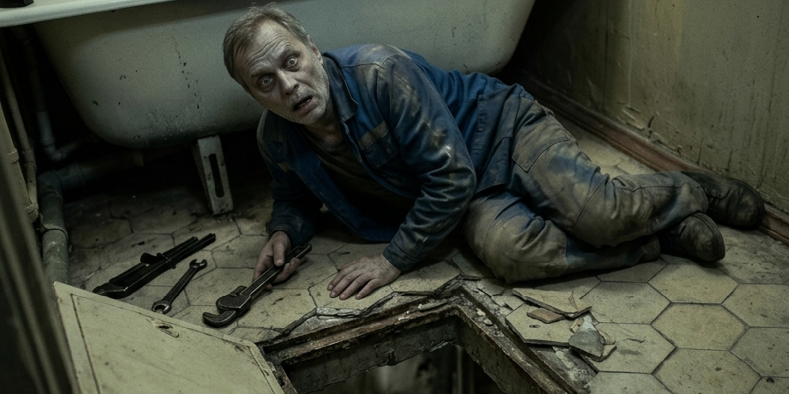Она не спорила — увидела моё лицо. Через минуту я был один. Взял фонарь, лёг на пол и полез под ванну. Нашёл люк — фанерный лист, шестьдесят на шестьдесят, утопленный в бетон перекрытия. Валерий задел его рукой, сдвинул край. Я отодвинул полностью.