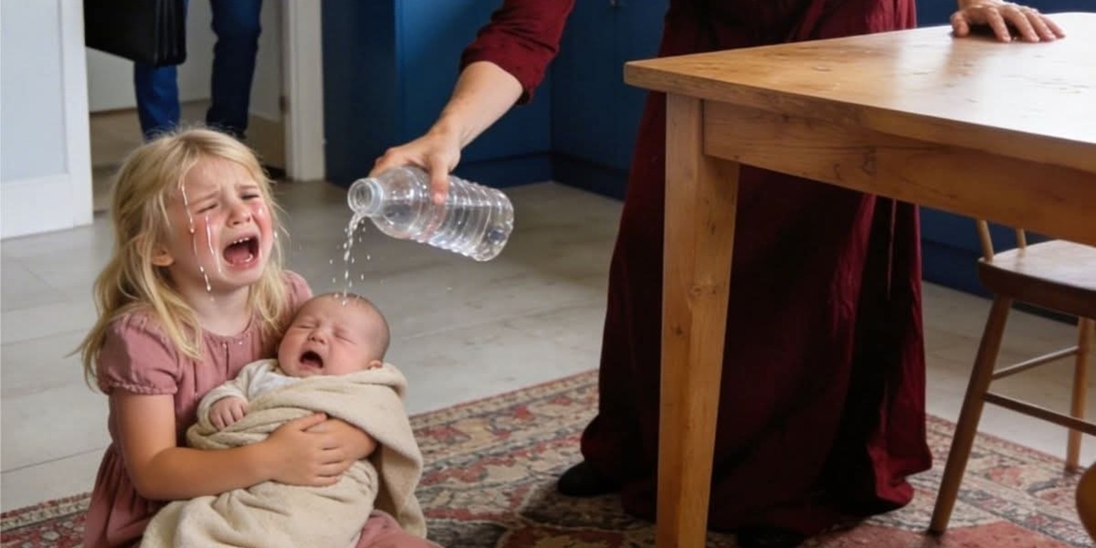 В углу комнаты, за перевёрнутым детским столиком, сидела Лили. Ей было шесть. Она прижимала к себе Ноа — двухлетнего, в мокром подгузнике, с лицом, красным от плача. Девочка обхватила брата обеими руками и закрывала его собой, как живой щит.