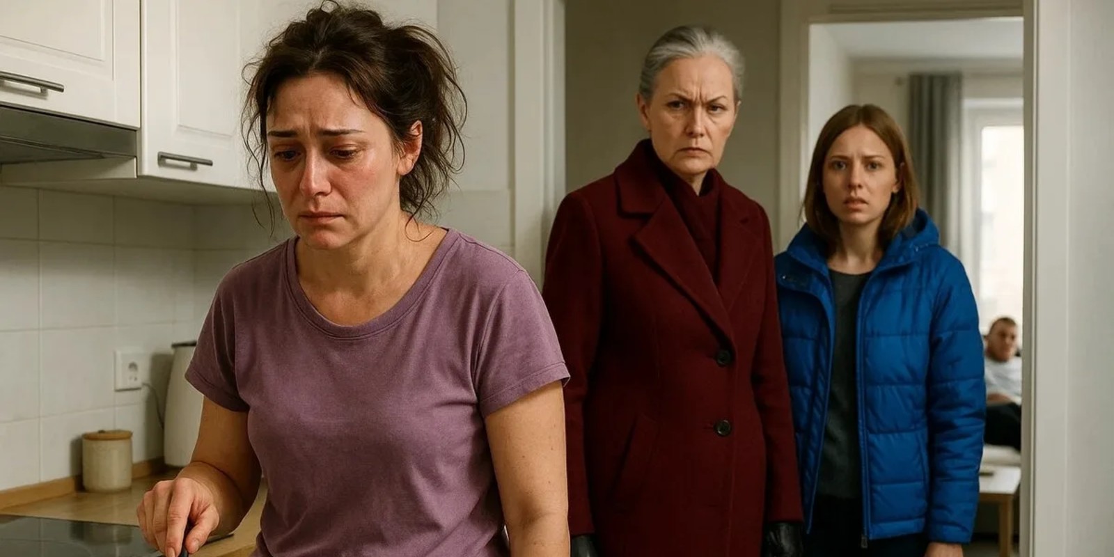 В квартире стало тихо. Виктория Петровна прошла в кухню и села за стол. Алла — рядом. Максим остался стоять в дверном проёме, как подросток, вызванный к директору.